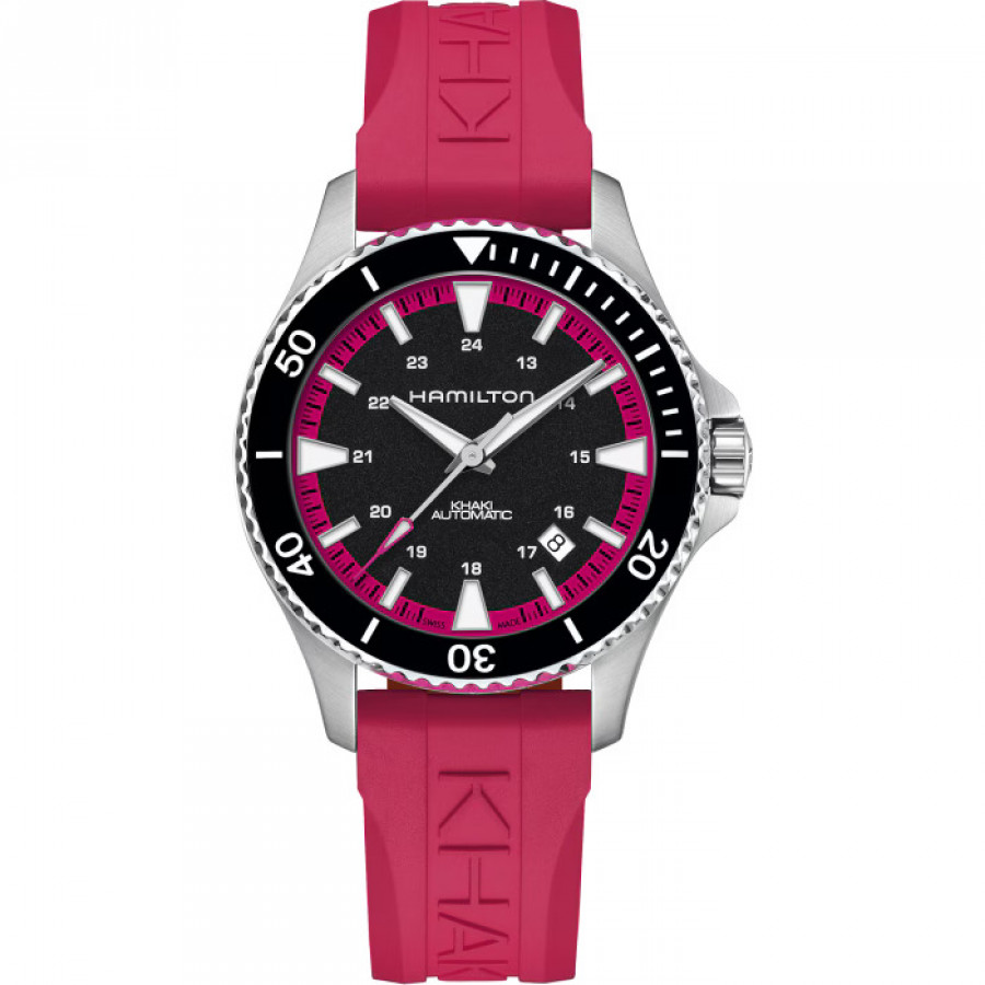 Sulla spiaggia, a bordo piscina o nelle profondità marine, lo stile del nuovo Hamilton Khaki Navy Scuba fa sempre colpo. Pensato per i marinai moderni, i surfisti, gli amanti dello snorkeling o della spiaggia, è accattivante e funzionale grazie al cinturino in caucciù rosa acceso e al quadrante nero a contrasto. Il tuo compagno ideale per cronometrare una nuotata, una corsa o per un momento di relax al sole.
