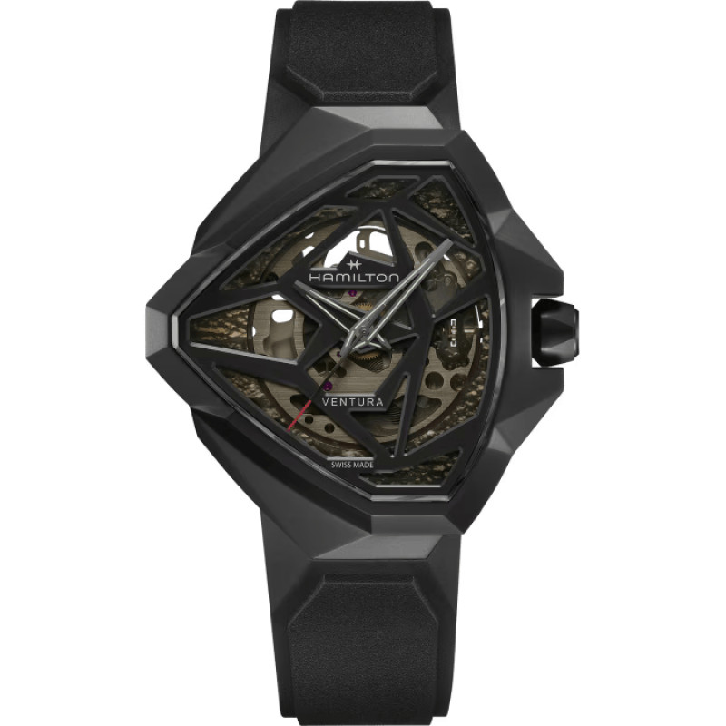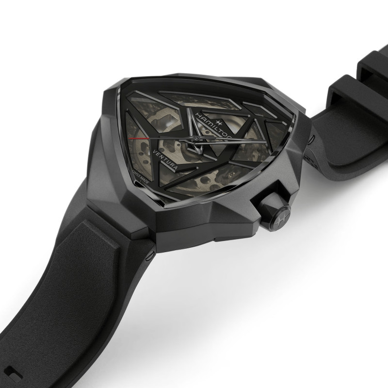 Sfidando le convenzioni, l'Hamilton Ventura Edge Skeleton fa un audace passo nel futuro dell’orologeria. Distaccandosi dall’iconica struttura triangolare della cassa del Ventura, presenta un nuovo e audace design architettonico. Scuro, enigmatico e dal design radicale, questo segnatempo gioca con luci e ombre, aggiungendo una profondità quasi ultraterrena alla sua forma. Al suo interno si trova il movimento H-10-S, incorniciato da una cassa nera e rivelato progressivamente dall’effetto sfumato scheletrato del quadrante. Questo segnatempo è corredato da un cinturino in caucciù nero.