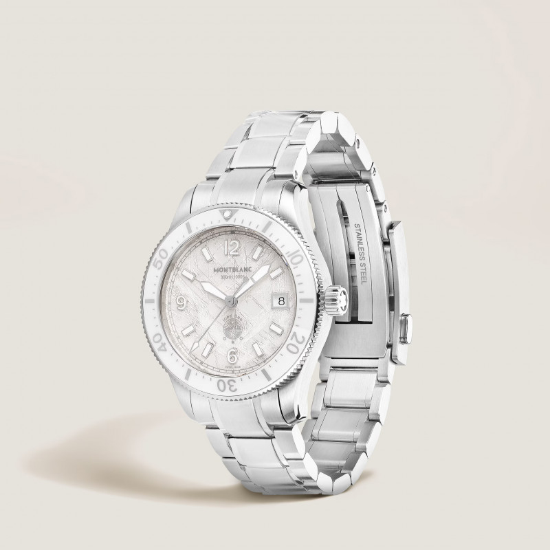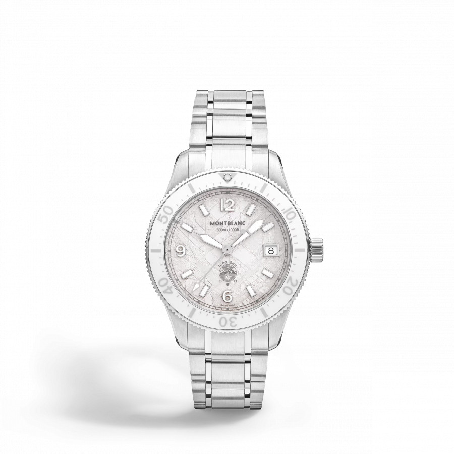 Il Montblanc Iced Sea Automatic Date 0 Oxygen con quadrante bianco con motivo “ghiacciaio” dà l’impressione di guardare nelle profondità di un ghiacciaio. Ispirata al Mer de Glace, questa texture glaciale è stata ottenuta utilizzando una tecnica ancestrale quasi dimenticata chiamata gratté-boisé. Il segnatempo è custodito in una cassa da 38 mm in acciaio pregiato totalmente priva di ossigeno con lunetta girevole unidirezionale con inserto in ceramica bianca un’incisione 3D sul fondello e un bracciale intercambiabile in acciaio pregiato con regolazioni raffinate. Il segnatempo è conforme alla norma ISO 6425 relativa alle immersioni subacquee e offre un’impermeabilità fino a 300 metri.
