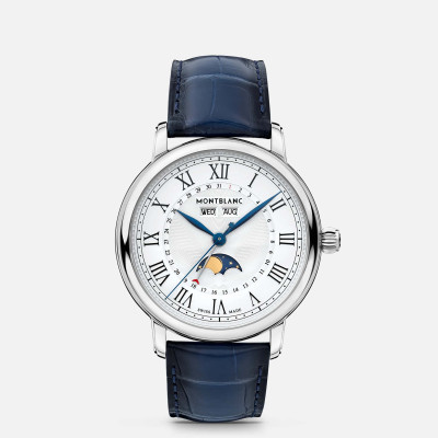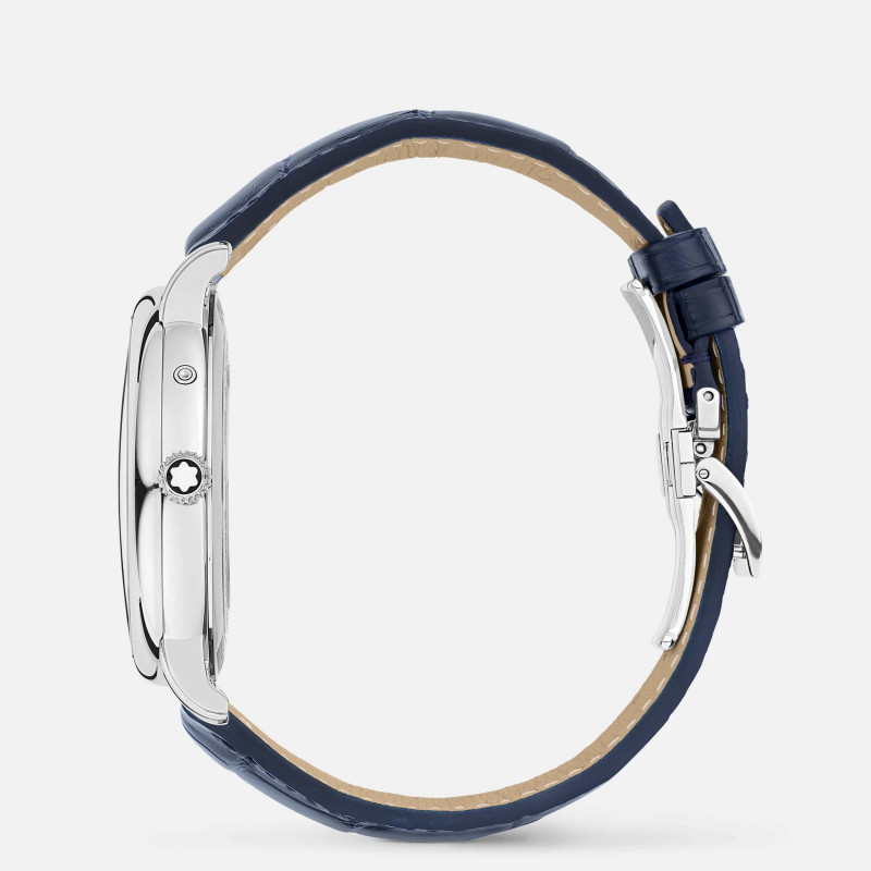La linea Montblanc Star Legacy trae ispirazione dal patrimonio Minerva e dagli orologi da tasca realizzati dalla Manifattura tra la fine del XIX secolo e l’inizio del XX. Il Montblanc Star Legacy Full Calendar presenta un’elegante cassa in acciaio pregiato da 42 mm con anse dritte ed elementi rialzati sui lati e integra diversi tratti distintivi del design dell’epoca con la cassa tonda, satinata e a forma di ciottolo; corone a cipolla con l’inconfondibile emblema Montblanc e raffinati quadranti con l’iconico motivo guilloché a stella esplosa. Il modello presenta numeri romani e lancette a foglia blu. Tra gli altri dettagli del quadrante figurano una minuteria “chemin de fer” a puntini e un motivo “filet sauté” intorno alla parte esterna del quadrante, una lancetta della data con punta a mezzaluna rossa e un elegante emblema Montblanc sul contrappeso della lancetta dei secondi. Il segnatempo è animato dal calibro automatico MB 24.30 che indica ore, minuti, secondi, giorno, data, mese e fasi lunari. Il giorno della settimana e il mese compaiono in finestrelle sulla parte superiore del quadrante, mentre la parte inferiore è riservata alla visualizzazione delle fasi lunari. Il segnatempo presenta un cinturino in alligatore blu Sfumato.