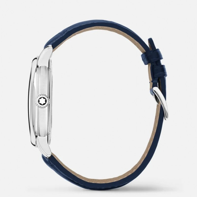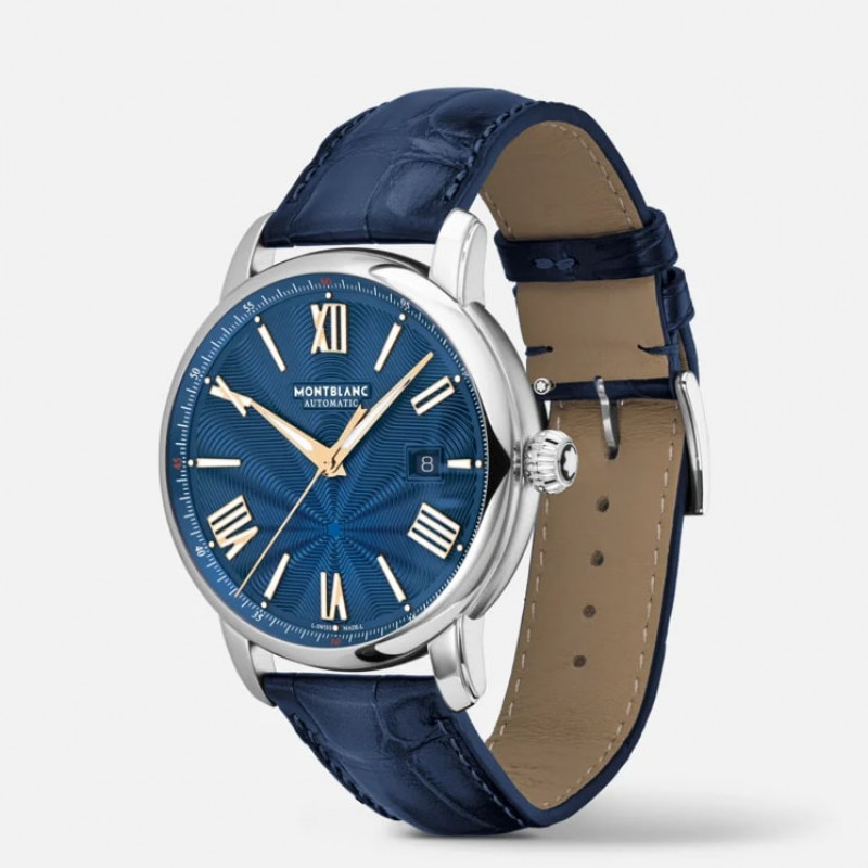 Il Montblanc Star Legacy Automatic Date in edizione limitata di 800 esemplari è impreziosito da un quadrante blu con l’iconico motivo a stella variabile Montblanc e con indici a forma di spada e numeri placcati oro rosa. È alimentato dal movimento automatico MB 24.17 che indica ore, minuti, secondi e data. In termini di design, il segnatempo si ispira agli orologi da tasca Minerva della fine del XIX secolo e inizio del XX con le loro casse rotonde, lucide e a forma di ciottolo e le corone a cipolla. Questo segnatempo è altresì dotato di un cinturino intercambiabile in pelle di vitello blu con stampa alligatore e impunture tono su tono.