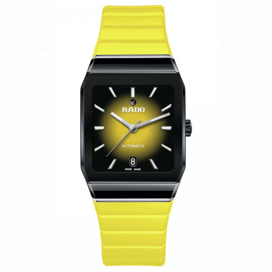 Fin dal suo debutto nel 1983, Rado Anatom è stato simbolo di un design all’avanguardia e di un comfort estremo. La sua caratteristica distintiva è il cristallo zaffiro metallizzato cilindrico, con smussatura simmetrica su entrambi i lati e continua che si fonde nella cassa in ceramica high-tech lucida, proseguendo attraverso le maglie finali in acciaio inossidabile lucido per unirsi infine nel cinturino affusolato in gomma verde lime. Questo insieme è assicurato da una fibbia a tripla piega in acciaio inossidabile spazzolato con una copertura in ceramica high-tech lucida. Sotto questo caratteristico cristallo si nasconde un quadrante con sfumature che spaziano dal nero al verde lime. Le lancette e gli indici applicati color rodio sono rivestiti con Super-LumiNova® bianca che crea un raffinato contrasto con la profondità del quadrante. A coronare il quadrante a ore 12 c’è l’iconica ancora mobile, accompagnata da una finestrella discreta per la data, posizionata a ore 6. Nel suo cuore pulsante, esaltato dal fondello in vetro zaffiro, batte un calibro automatico R766 a 21 rubini. Regolato finemente in cinque posizioni e dotato di una spirale Nivachron™, questo movimento offre un alto livello di precisione e una notevole riserva di carica di 72 ore, sottolineando l’impegno di Rado per la perfezione.