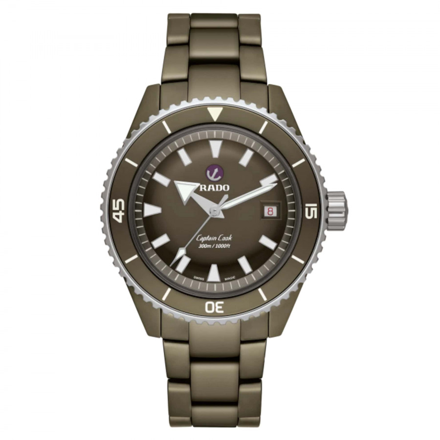 Il Rado Captain Cook High-Tech Ceramic Diver è impermeabile fino a 300m. Le lancette e gli indici di questo orologio subacqueo certificato ISO 6425 sono rivestiti in SuperLuminova® per garantire un’eccellente visibilità sul quadrante verde oliva opaco. La cassa monoblocco da 43mm è realizzata in ceramica hi-tech verde oliva opaca e la lunetta girevole è in acciaio indurito lucido. Al suo interno, il movimento automatico Rado R763 supera i requisiti standard nei test di precisione da 3 a 5 posizioni e offre 80 ore di riserva di carica. Questo esemplare è dotato di un bracciale in ceramica hi-tech verde oliva opaca. Qualunque sia il tuo campo di esplorazione, il Captain Cook High-Tech Ceramic Diver sarà un partner affidabile e solido, al tuo polso per gli anni a venire.