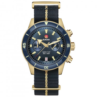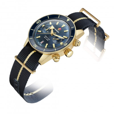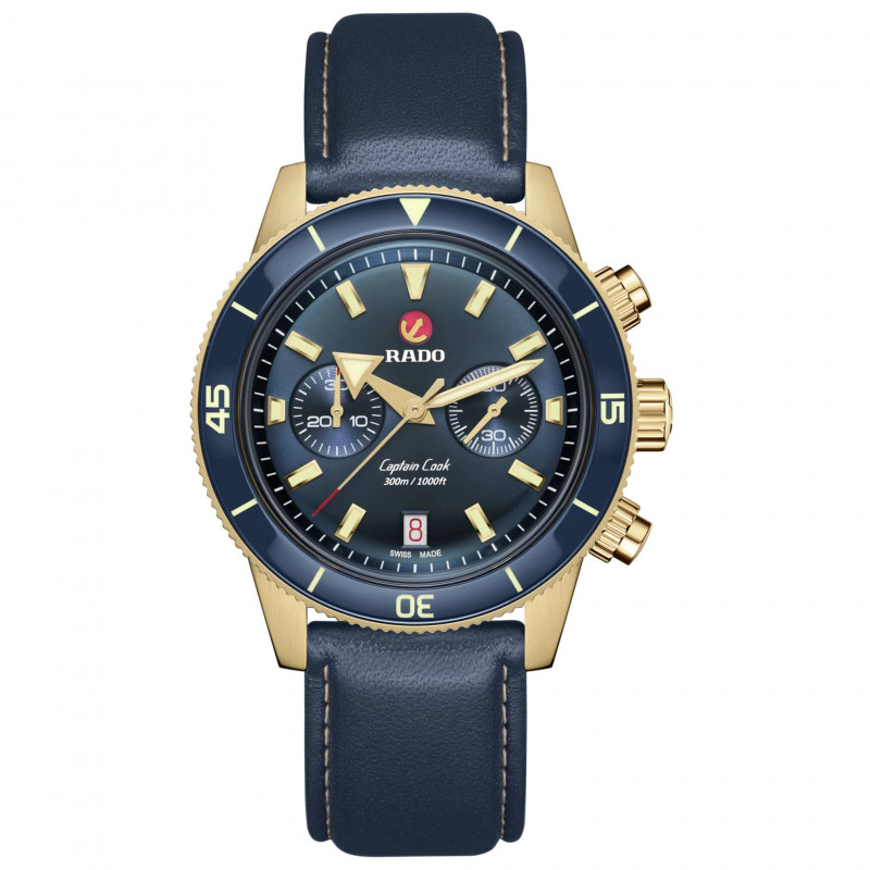 Il Rado Captain Cook Chronograph vanta il caratteristico cristallo zaffiro sagomato antigraffio con trattamento antiriflesso su entrambi i lati. La cassa sottile ed elegante da 43 mm in bronzo spazzolato dispone di un inserto in ceramica hi-tech blu lucido sulla lunetta, in abbinamento al quadrante blu soleil. Numeri, indici e triangoli sono rivestiti in Super-LumiNova®. All'interno, il nuovo e più sottile movimento automatico R801, con 37 rubini, cinque lancette e 59 ore di riserva di carica grazie alla spirale antimagnetica Nivachron™ supera i requisiti standard nei test di precisione da 3 a 5 posizioni. L’esemplare è dotato di un cinturino in tessuto con una banda color oro al centro, oltre a un cinturino in pelle blu e a un cinturino aggiuntivo in tessuto blu scuro.