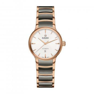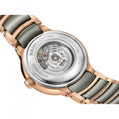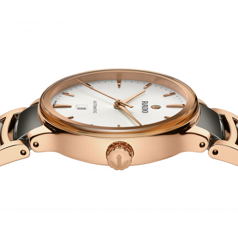Il classico Rado Centrix Automatic è stato rielaborato non solo tecnicamente, ma anche esteticamente. Il nuovo modello dispone di un cristallo zaffiro arrotondato che si estende fino al bordo e di una cassa ricurva che si integra con l’estremità del cristallo. Le anse della cassa ridisegnate e il bracciale in acciaio lucido rivestito in PVD color oro rosa con maglie centrali in ceramica hi-tech al plasma completano l’estetica rinnovata di questo iconico segnatempo. Il quadrante soleil color argento, con indici applicati color oro rosa, si abbina perfettamente alle lancette color oro rosa. All’interno, il calibro R582 a tre lancette supera gli standard di precisione nei test da 3 a 5 posizioni e grazie alla spirale antimagnetica Nivachron™ garantisce elevata affidabilità e puntualità. L’orologio è impermeabile fino a 50 m e offre una riserva di carica di 48 ore.
