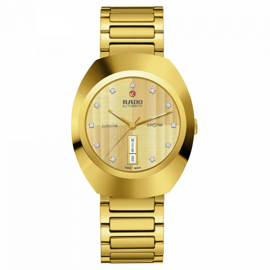 L’esclusivo DiaStar Original ha un diametro di 38 mm ed è impermeabile fino a 100 m. Incorniciato da una lunetta super brillante in Ceramos™ color oro giallo con angoli e dettagli lucidi incastonata su una cassa coordinata in acciaio e rivestita da PVD color oro giallo, questo bellissimo orologio vanta un cristallo zaffiro sfaccettato a linee parallele. Tra le caratteristiche figurano il quadrante oro spazzolato con lancette a bastone color oro giallo con Super-LumiNova® bianca e un datario bianco. Il quadrante presenta undici diamanti a taglio brillante, valorizzati dal logo “jubilé” stampato in grigio scuro. Il movimento automatico Rado R764 offre 80 ore di riserva di carica, con una spirale antimagnetica Nivachron™. Il bracciale è in acciaio lucido e spazzolato con rivestimento in PVD color oro giallo.