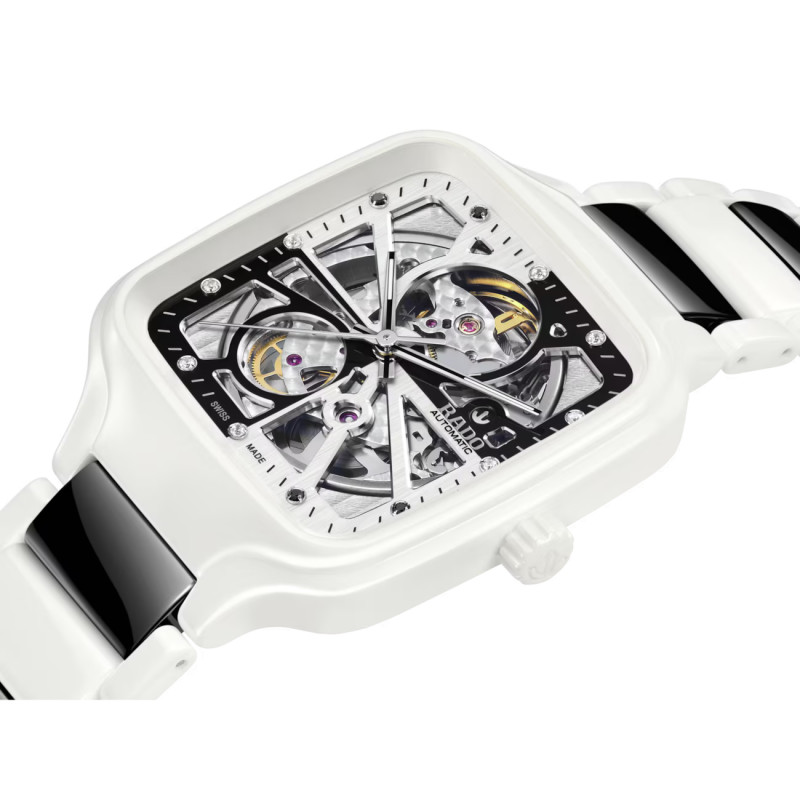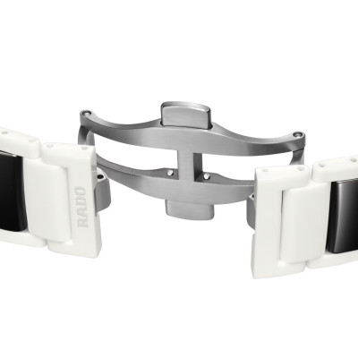 Questo orologio orologio ha una cassa e una corona monoblocco in ceramica high-tech bianca e il cinturino,anch'esso in ceramica high-tech lucida, è bianco e nero. Il fondello in titanio sabbiato è dotato di un cristallo zaffiro e di una speciale incisione con la scritta LIMITED EDITION ONE OUT OF 888. Come la sua controparte nera, presenta un quadrante spazzolato longitudinalmente bianco e nero evidenziato da otto indici delle ore con diamanti bianchi a taglio brillante e quattro neri. Condivide anche alcuni degli altri codici estetici che caratterizzano lo straordinario quadrante: smussi color rodio, flangia nera e il caratteristico simbolo dell'ancora mobile color rodio su uno sfondo nero a contrasto. E la sua identità è confermata dai loghi Rado, stampato in argento, e Automatic in nero.