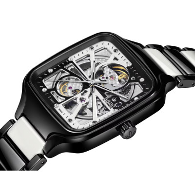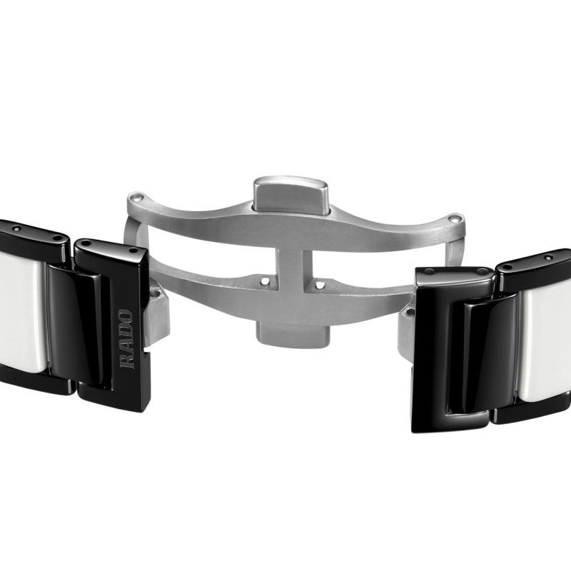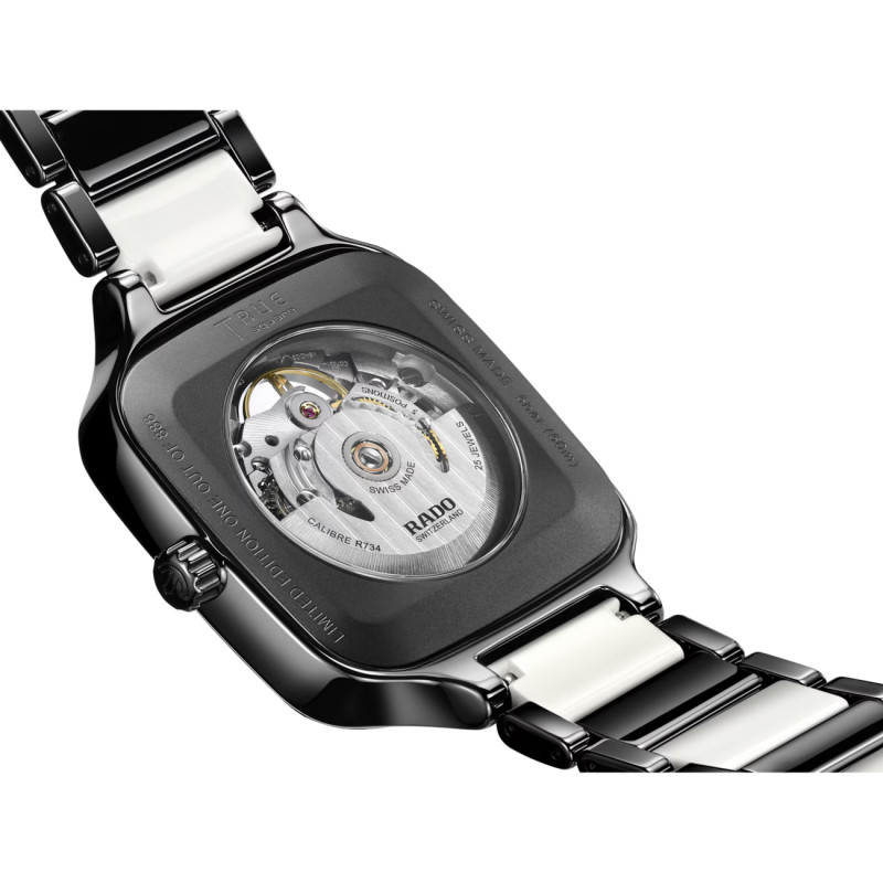 Questo orologio presenta una cassa monoblocco in ceramica high-tech nera e una corona su un bracciale in ceramica high-tech lucida nera e bianca. Ha un fondello in titanio sabbiato PVD nero con incisa la scritta LIMITED EDITION ONE OUT OF 888. Il cristallo zaffiro offre una visione del movimento decorato con grani circolari che alimenta l'orologio. Il quadrante bianco e nero spazzolato longitudinalmente è caratterizzato da otto diamanti Top Wesselton a taglio brillante e quattro diamanti neri come indici delle ore. A sottolineare il quadrante Open Heart sono anche le smussature color rodio, una flangia nera e il familiare simbolo dell'ancora mobile color rodio di Rado su uno sfondo nero. La presentazione è completata dai loghi Rado, stampato in argento, e Automatic in nero. Le sfere color rodio hanno un rivestimento nero e Super-LumiNova® bianca.