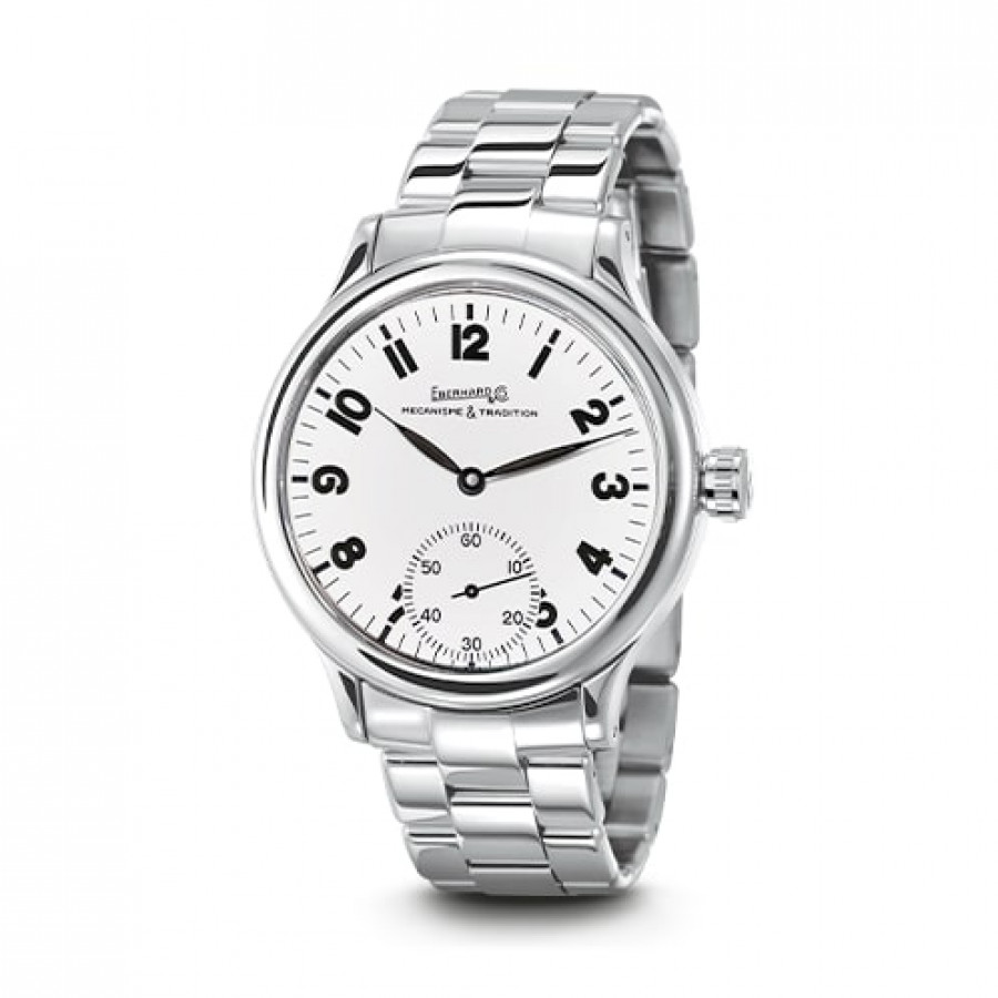 Acciaio meccanico manuale, vetro zaffiro bombato, corona in acciaio, impermeabile, personalizzata "E", fondo impresso a conio con scritte in rilievo, serrato da 8 viti, bracciale Chaland in acciaio. Cinturino in cuoio fibbia in acciaio, chiusura Déployante Déclic® – Patented.