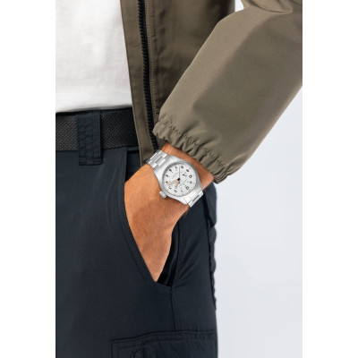 Il Khaki Field Mechanical Power Reserve 40 mm rende omaggio al design tradizionale e alla funzionalità essenziale della famiglia Khaki, introducendo al contempo caratteristiche moderne e le ultime novità in fatto di tecnologia e innovazione orologiere. Dotato di un nuovo movimento a carica manuale H-23, sviluppato da ETA in esclusiva per Hamilton, consente per la prima volta di visualizzare direttamente sul quadrante la riserva di carica di 80 ore. Dotato di un bracciale in acciaio, il quadrante bianco mostra le diciture “power reserve 80 hours” (“riserva di carica di 80 ore”), “F” (completamente carico) ed “E” (scarico), sottolineando questa caratteristica funzionale d’eccezione.