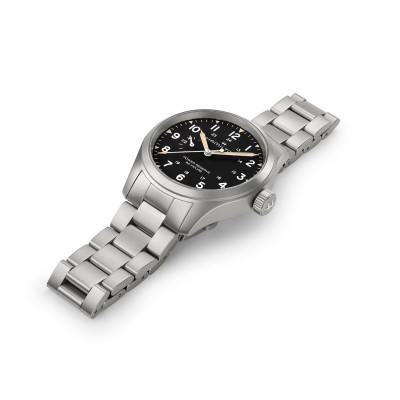Il Khaki Field Mechanical Power Reserve 40 mm rende omaggio al design tradizionale e alla funzionalità essenziale della famiglia Khaki, introducendo al contempo caratteristiche moderne e le ultime novità in fatto di tecnologia e innovazione orologiere. Dotato di un nuovo movimento a carica manuale H-23, sviluppato da ETA in esclusiva per Hamilton, consente per la prima volta di visualizzare direttamente sul quadrante la riserva di carica di 80 ore. Dotato di un bracciale in acciaio, il quadrante nero mostra le diciture “power reserve 80 hours” (“riserva di carica di 80 ore”), “F” (completamente carico) ed “E” (scarico), sottolineando questa caratteristica funzionale d’eccezione.