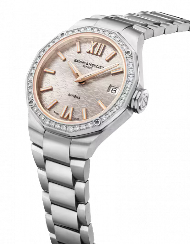 Baume & Mercier presenta il Riviera 10796, ultra-femminile, dal diametro di 33 mm e dotato di movimento al quarzo, con quadrante argento caldo satinato soleil, bracciale integrato intercambiabile in acciaio e lunetta impreziosita da 44 diamanti (taglio brillante, Top Wesselton, qualità VS, 0,47 carati) incastonati a neve. In questa versione, il Riviera si rivolge alle donne alla ricerca di un orologio prezioso che sia elegante, bello e semplice. Un lusso discreto perfettamente rappresentato dalla Maison.