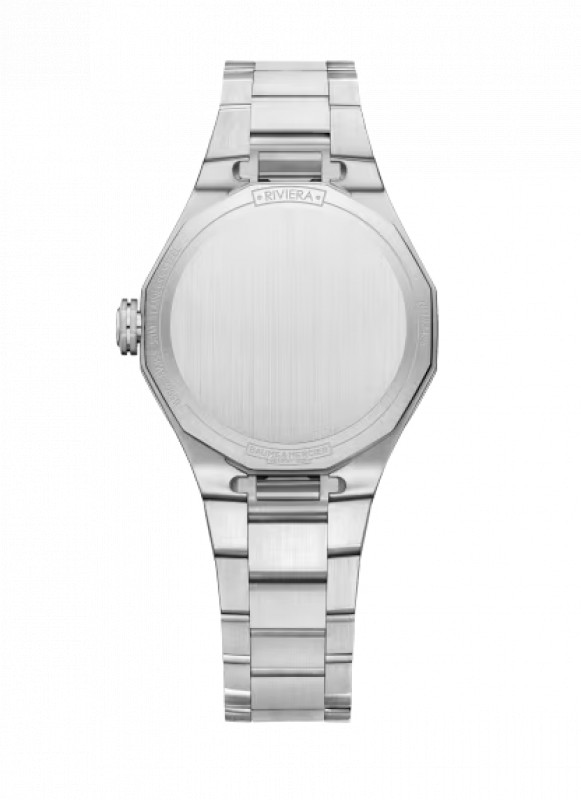 Il Riviera 10796 brilla più di qualsiasi altro modello. Sulla lunetta sono incastonati 44 diamanti, mentre il quadrante in argento caldo satinato con finitura soleil è decorato con un motivo a onde trasparente, presenta inoltre numeri romani e indici rivettati e rodiati 5N rivestiti in Superluminova bianco. Il bracciale intercambiabile in acciaio inossidabile è dotato di un sistema affidabile per la sostituzione senza attrezzi.