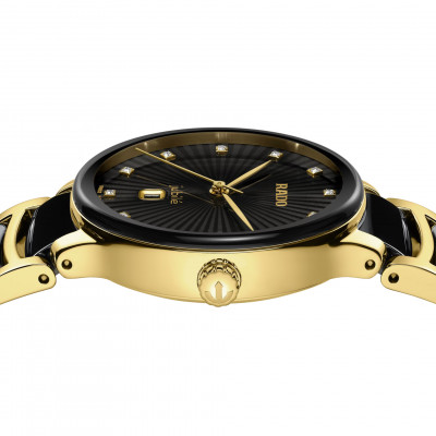 Il classico Rado Centrix Quartz Diamonds è stato rielaborato non solo tecnicamente, ma anche esteticamente. Il nuovo modello dispone di un cristallo zaffiro arrotondato che si estende fino al bordo e di una cassa ricurva che si integra con l’estremità del cristallo. L’estetica rinnovata di questo iconico segnatempo è ultimata dalle anse della cassa ridisegnate e dal bracciale in acciaio rivestito in PVD color oro giallo lucido con maglie centrali in ceramica high-tech nera. Il quadrante nero sfaccettato con 12 diamanti offre uno spettacolare effetto ottenuto tramite la stampa di un quadrante sagomato che viene poi riempito di lacca. Grazie al movimento al quarzo calibro R079 dotato di PreciDrive e HeavyDrive, il segnatempo è dotato di grande precisione e resistenza agli urti. L'orologio è impermeabile fino a 50 m.