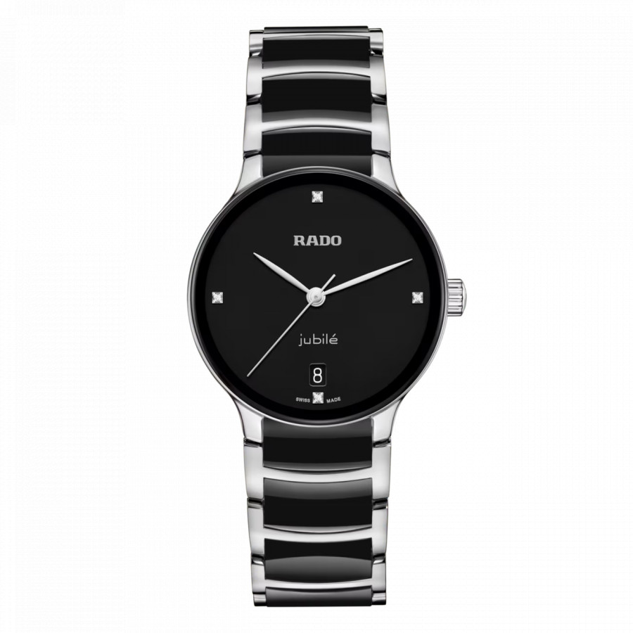 Il classico Rado Centrix Quartz Diamonds è stato rielaborato non solo tecnicamente, ma anche esteticamente. Il nuovo modello dispone di un cristallo zaffiro arrotondato che si estende fino al bordo e di una cassa ricurva che si integra con l’estremità del cristallo. Le anse della cassa ridisegnate e il bracciale in acciaio lucido con maglie centrali in ceramica high-tech nera completano l’estetica rinnovata di questo iconico segnatempo. Il quadrante nero laccato, impreziosito da 4 brillanti e sottolineato dal logo “jubilé” stampato, si abbina perfettamente alle lancette color rodio. Grazie al movimento al quarzo calibro R073 dotato di PreciDrive e HeavyDrive, il segnatempo è dotato di grande precisione e resistenza agli urti. L'orologio è impermeabile fino a 50 m.