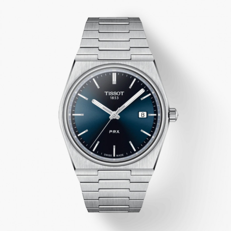 Nel 1978 Tissot creò un modello al quarzo, caratterizzato da una cassa sottile, indici stretti e un bracciale in acciaio. La sua ampia ansa orizzontale, tipica dell'epoca, era perfettamente integrata nella cassa piatta a forma di tonneau. Pochi anni dopo, Tissot ha registrato il nome PRX. "PR" sta per "preciso" e "robusto". La "X" sta per il numero romano dieci e per la pressione di 10 bar che l'orologio è in grado di sopportare. Nel 2021 Tissot ha presentato il PRX 40205, È una versione moderna del modello precedente. La cassa in acciaio inossidabile 316L del Tissot PRX 40205 ha un diametro di 40 mm. Ha una forma leggermente tonneau ed è ornato da una lunetta stretta e rotonda. Ai lati, spazzolate verticalmente, finiture arrotondate si alternano a sfaccettature lucide. Il Tissot PRX 40205 Quartz è dotato di un quadrante con un motivo a raggiera nero o blu in combinazione con indici e lancette nichelati. Esiste anche una variante con quadrante grigio argento satinato con indici e lancette color oro rosa, una combinazione di colori che ricorda la fine degli anni '70. La flessibilità e morbidezza delle maglie ne fanno un vero successo di design ergonomico e trasmettono uno straordinario comfort. Le lancette del PRX 40 205 sono dotate di un rivestimento SuperLumiNova® e sono posizionate l'una sull'altra con uno spazio minimo. Ciò consente di avvicinare il quadrante al vetro dell'orologio. L'effetto ottico ottenuto dai designer Tissot fa sembrare la cassa dell'orologio ancora più piatta e sottile di quanto non sia in realtà.