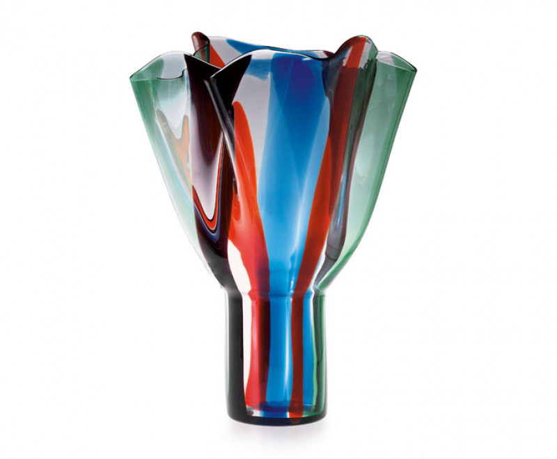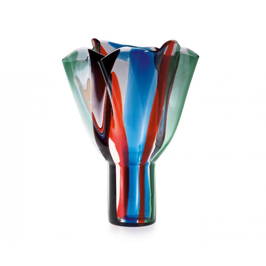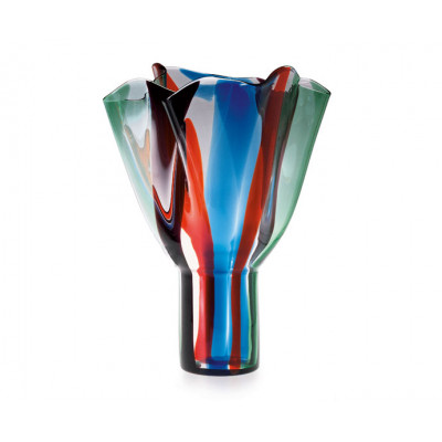Vasi in vetro soffiato lavorato e aperto a mano, decoro con fasce colorate.