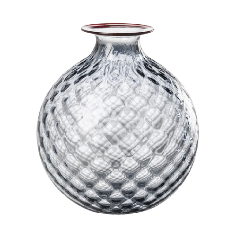Vaso in vetro soffiato lavorato a mano con la tradizionale tecnica della lavorazione a Balloton, decorato con filo riportato a caldo sulla parte superiore dell’oggetto.