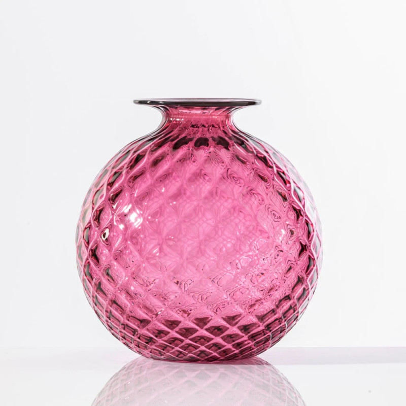 Sembra morbido, eppure è vetro. L'illusione ottica del Monofiori di VENINI del 1970 è nel suo nome: Balloton, la lavorazione unica che ricrea sulla superficie l'effetto matelassé. L'opera è lavorata a mano, soffiata nel caratteristico stampo in metallo e finita nel collo sottile con un filo colorato applicato a caldo, che varia nel colore.
