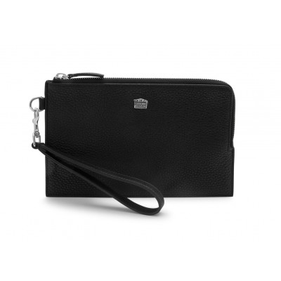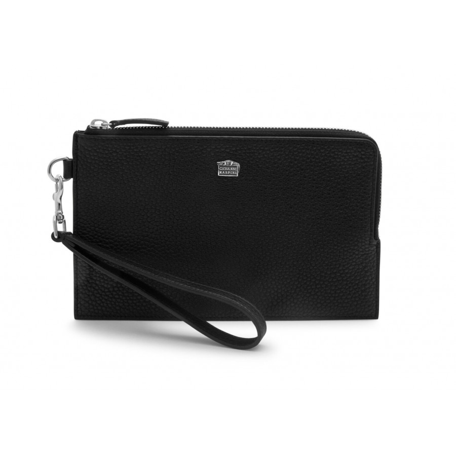 Realizzato in pregiata pelle di vitello goffrata nera, questa pouch è il modello più grande della collezione, versatile e ideale per chi desidera spazio senza rinunciare allo stile. La pouch, dotata di un comodo laccio da polso staccabile in pelle e metallo, si chiude con una robusta cerniera, la quale garantisce che tutti gli oggetti contenuti siano al sicuro. All'interno è presente un unico grande scomparto, munito di 3 tasche aggiuntive per carte di credito. Questo prodotto rappresenta la massima eccellenza artigianale che da sempre contraddistingue il brand Giovanni Raspini, ed è impreziosito da un caratteristico elemento in Argento 925, realizzato in fusione a cera persa e raffigurante il logo del brand in miniatura, sovrastato dall'iconico coccodrillo. Lavorato interamente a mano in Toscana.