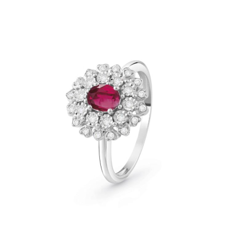 Anello Bliss in oro bianco, diamanti e rubino della collezione Vittoria