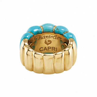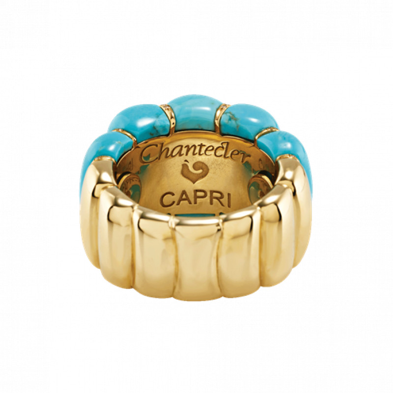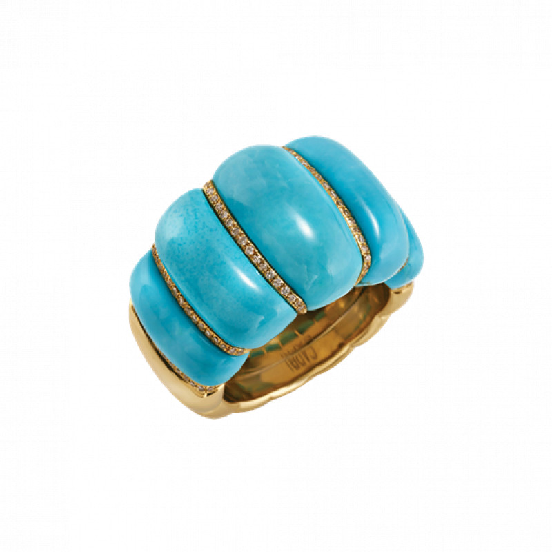 Anello Chantecler a fascia corno in oro giallo 18kt, diamanti taglio brillante e cinque spole in turchese naturale, collezione Corni.