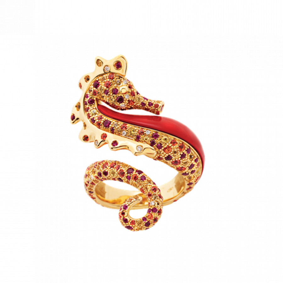 Anello Chantecler Cavalluccio in oro giallo 18kt, diamanti, zaffiri gialli e arancio, rubini e corallo composito, collezione Mediterranea.