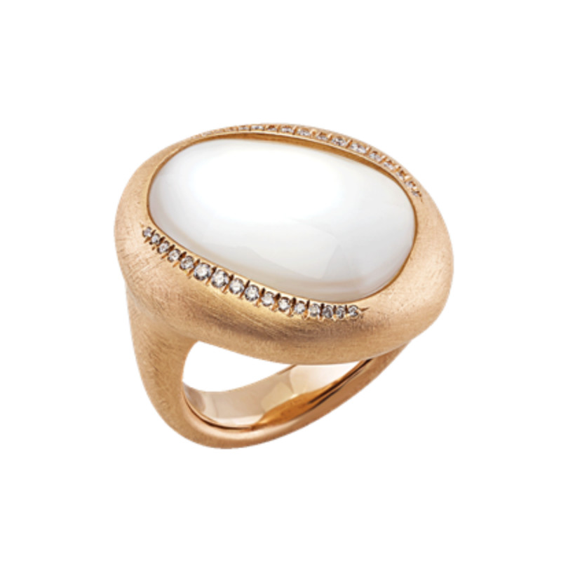 Anello Chantecler in oro giallo satinato 18Kt, diamanti, madreperla e cristallo di rocca appartenente alla collezione Enchanté.
