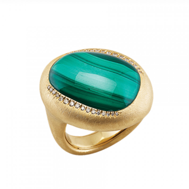 Anello Chantecler in oro giallo satinato 18Kt, diamanti, malachite e cristallo di rocca appartenente alla collezione Enchanté.
