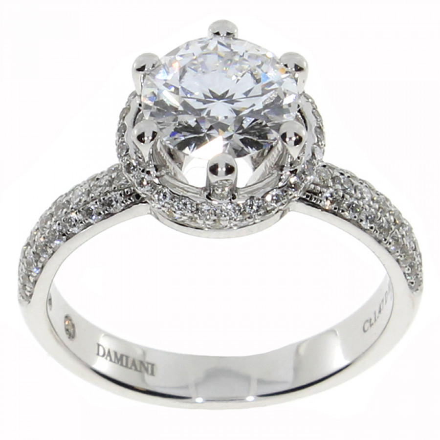 Anello solitario Damiani Minou in oro bianco e full pavè di diamanti.