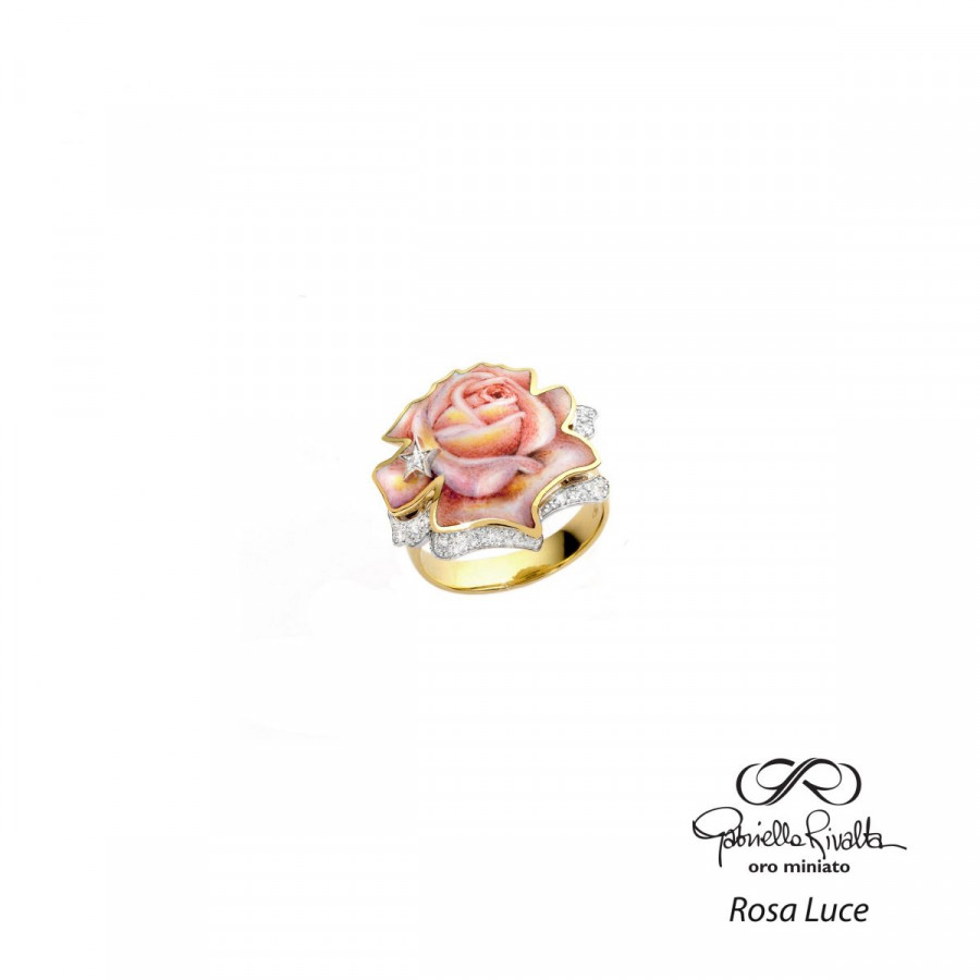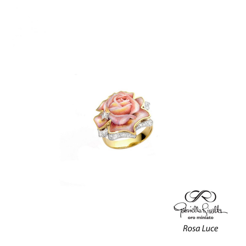 Anello in oro giallo 18kt Rosa Luce. La Rosa è finemente dipinta a mano con la tecnica dello smalto a gran fuoco ed ha un punto luce a stella in oro bianco con diamante. La Rosa è adagiata su un pavè di diamanti che rende questa creazione luminosa e preziosa.