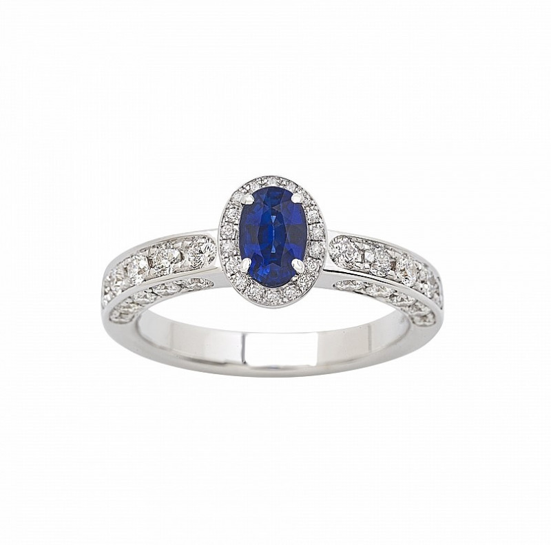 Giorgio Visconti anello solitario in oro bianco e zaffiro centrale taglio ovale con contorno e gambo di brillanti incassati a pavé.