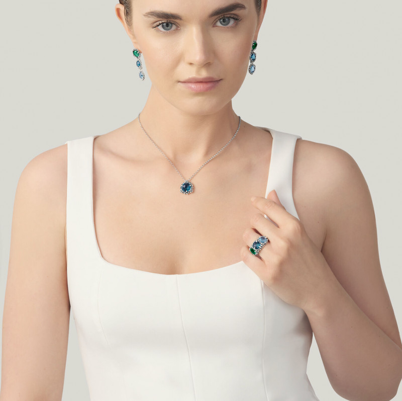 Tre cristalli rotondi sfaccettati, nei delicati toni del celeste, azzurro e verde smeraldo, danno vita all’anello Trilogy Blue Ivy. Il raffinato castone, realizzato con la tecnica della fusione a cera persa, si ispira a un motivo floreale, dove piccoli fiorellini dai petali bombati si moltiplicano fino a dissolversi in micro-sfere.