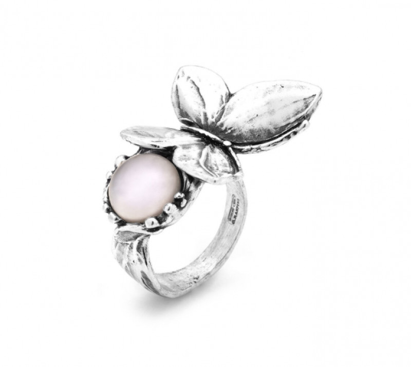 Un elegante connubio fra l'argento brunito e le delicate nuance rosa della pietra cabochon danno vita a questo anello che vive di luce e colore. Il volo della farfalla come gioiello contemporaneo.