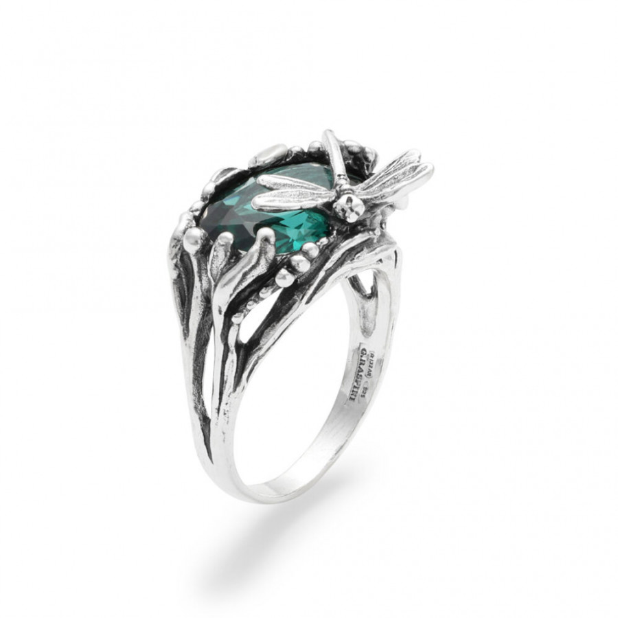 Un luminoso quarzo verde smeraldo incontra l'eleganza del decoro animalier in argento brunito, ottenuto con la tecnica della fusione a cera persa. Una libellula leggera e raffinata si appoggia su foglie di giunco, facendo di questo anello un gioiello unico.