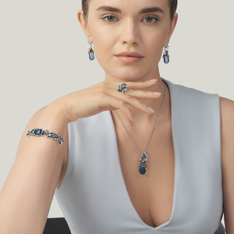 Un'eleganza eterea prende forma nell'anello Goccia Farfalle, dove leggere farfalle in argento, realizzate con la tecnica della fusione a cera persa, si posano delicatamente attorno a un cristallo nel suggestivo colore blu ciano.