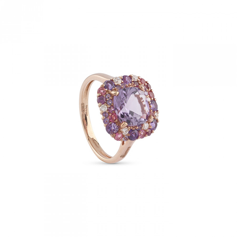 Anello Salvini Gioielli con ametista taglio cuscino con contorno di diamanti, tormalina, rodolite rosa e ametista, della collezione BonBon