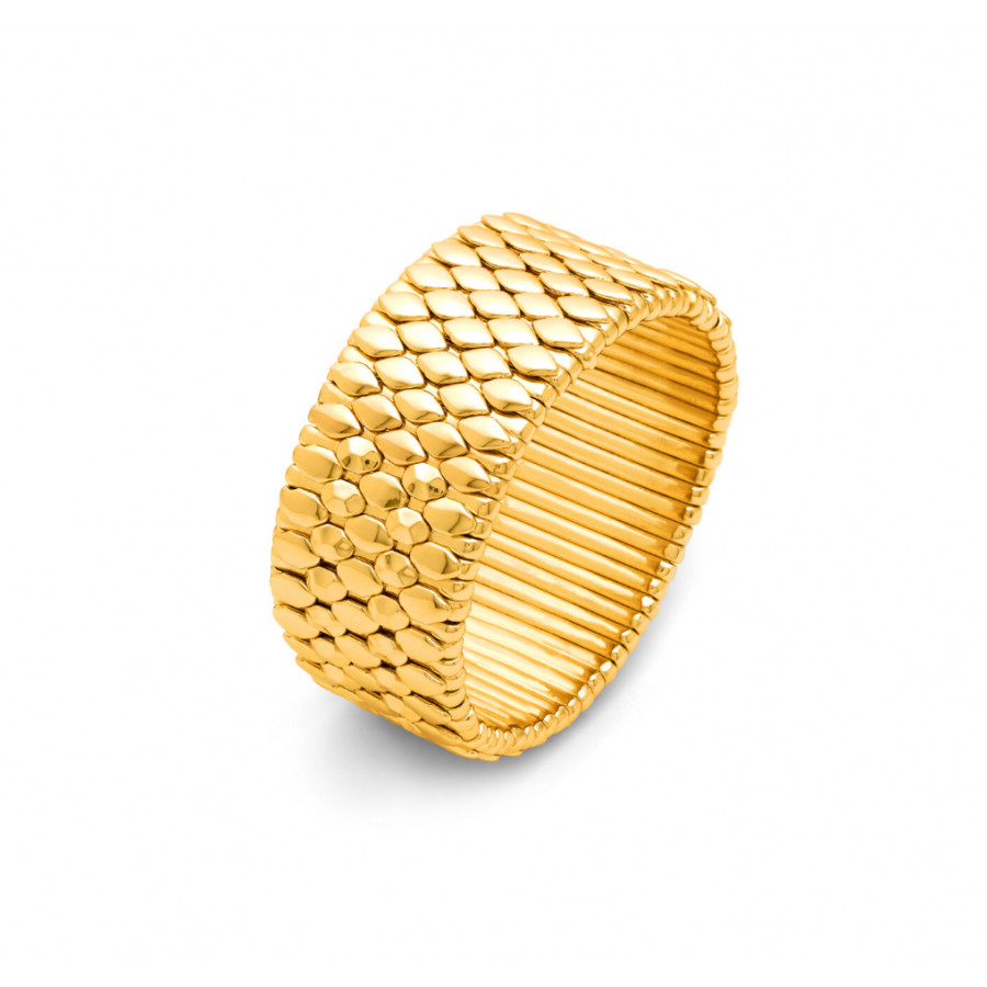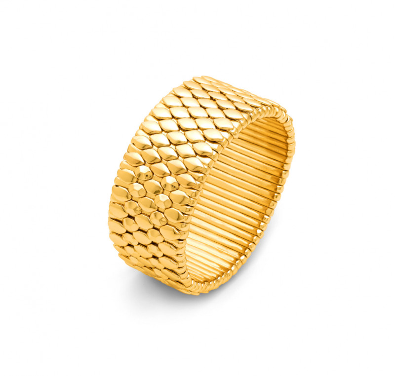Il bracciale si compone di una texture dinamica e contemporanea, capace di catturare la luce e suggerire un dinamismo visivo unico. La presenza di molle interne nascoste garantisce una vestibilità confortevole. Un gioiello fatto a mano, espressione dell’arte orafa e della maestria artigianale di Giovanni Raspini.