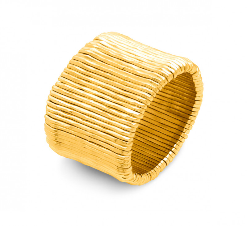 Un bracciale di grande impatto, dalla texture dinamica e contemporanea, capace di catturare la luce e suggerire un dinamismo visivo unico. La presenza di molle interne nascoste garantisce una vestibilità confortevole. Un gioiello fatto a mano, espressione dell’arte orafa e della maestria artigianale di Giovanni Raspini.