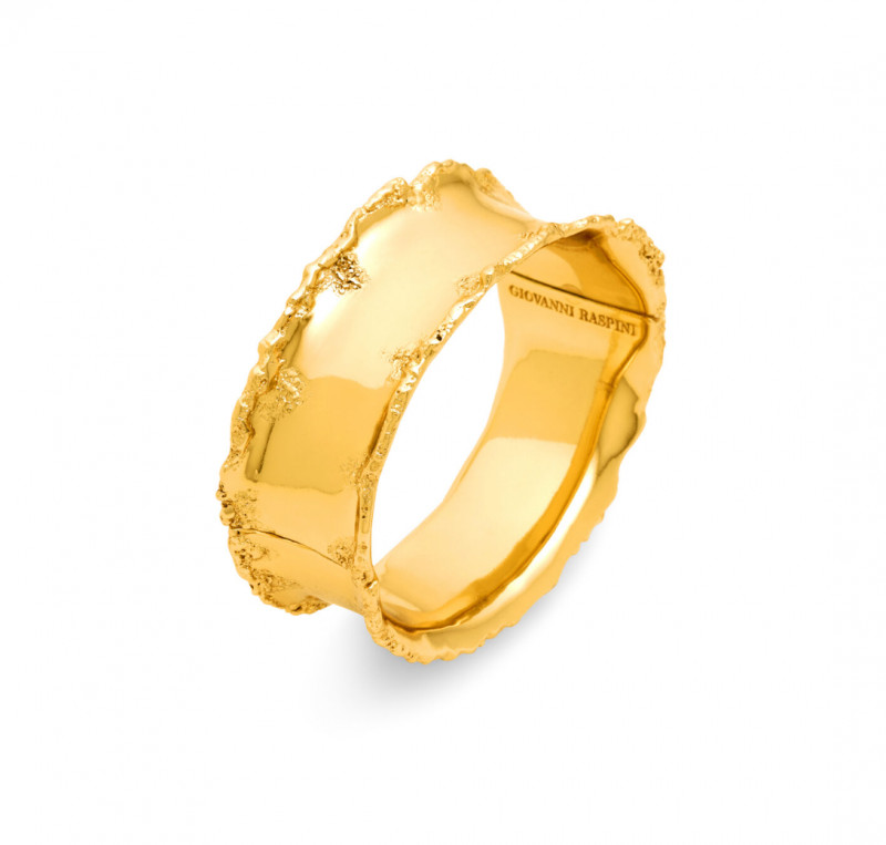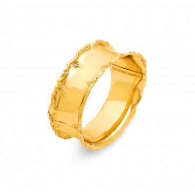 Un bracciale rigido elegante e luminoso, dotato di apertura a molla per un indosso confortevole. Realizzato in bronzo dorato, con texture sui bordi che incornicia una fascia centrale lucida, cattura lo sguardo con riflessi caldi e sofisticati. Racchiude tutto il fascino e la tradizione della fusione a cera persa. Fatto a mano in azienda.