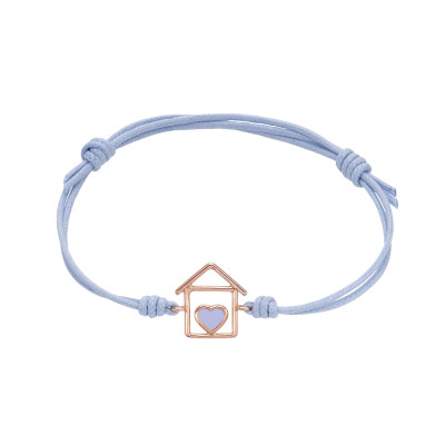 Bracciale con cordino celeste e simbolo casetta a filo in oro rosa 0.80 gr e cuore smaltato celeste
