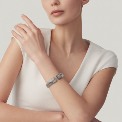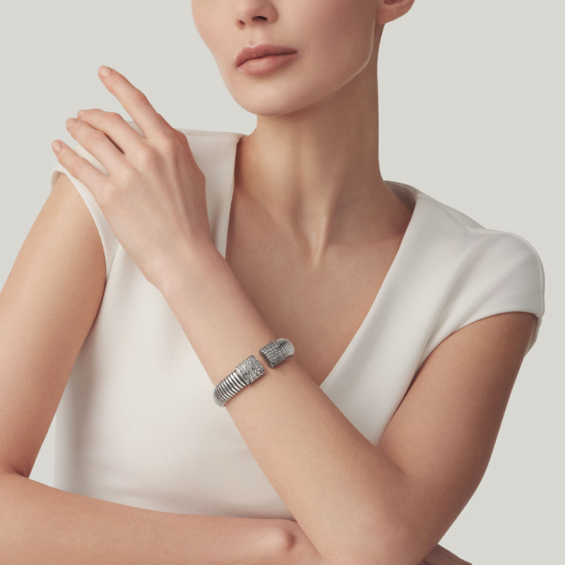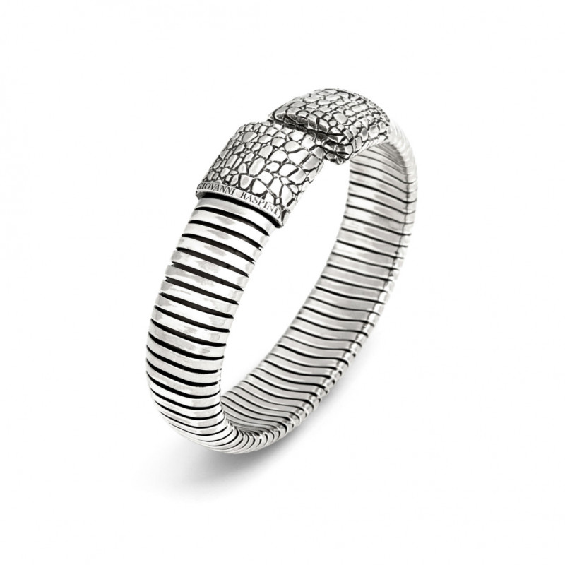Elegante e luminoso, realizzato in maglia tubogas, questo bracciale rigido in argento è un vero evergreen della gioielleria dal Novecento ad oggi. Giovanni Raspini lo personalizza mediante il segno iconico della texture di coccodrillo che impreziosisce le estremità realizzate in fusione a cera persa. Un capolavoro di eleganza e personalità.