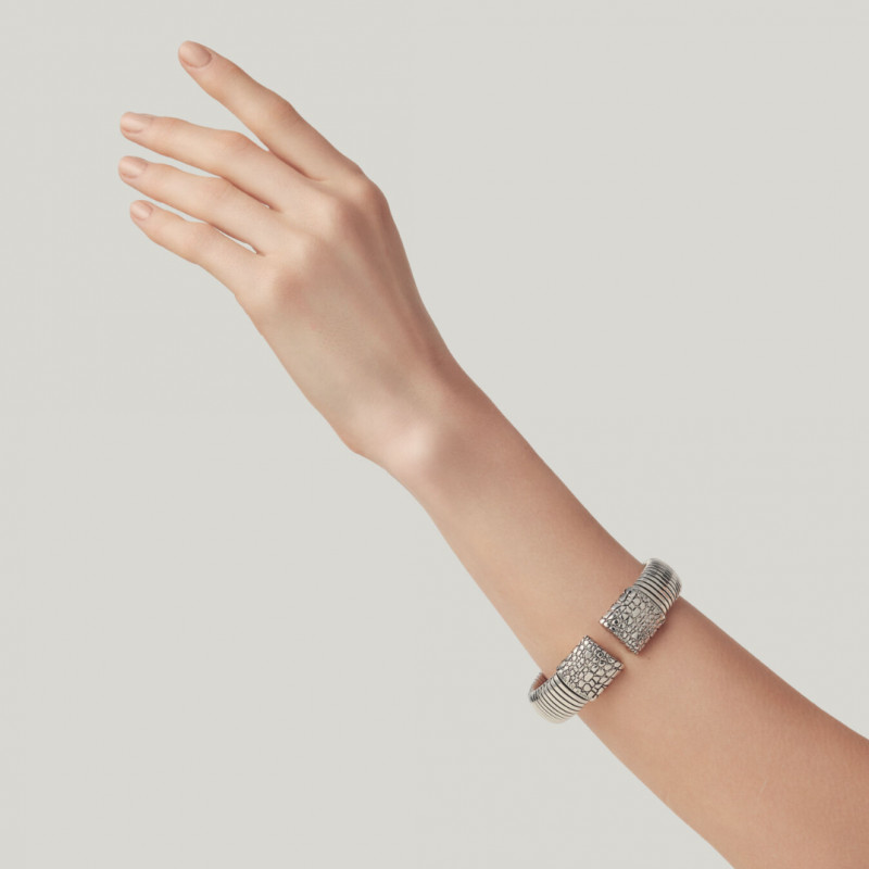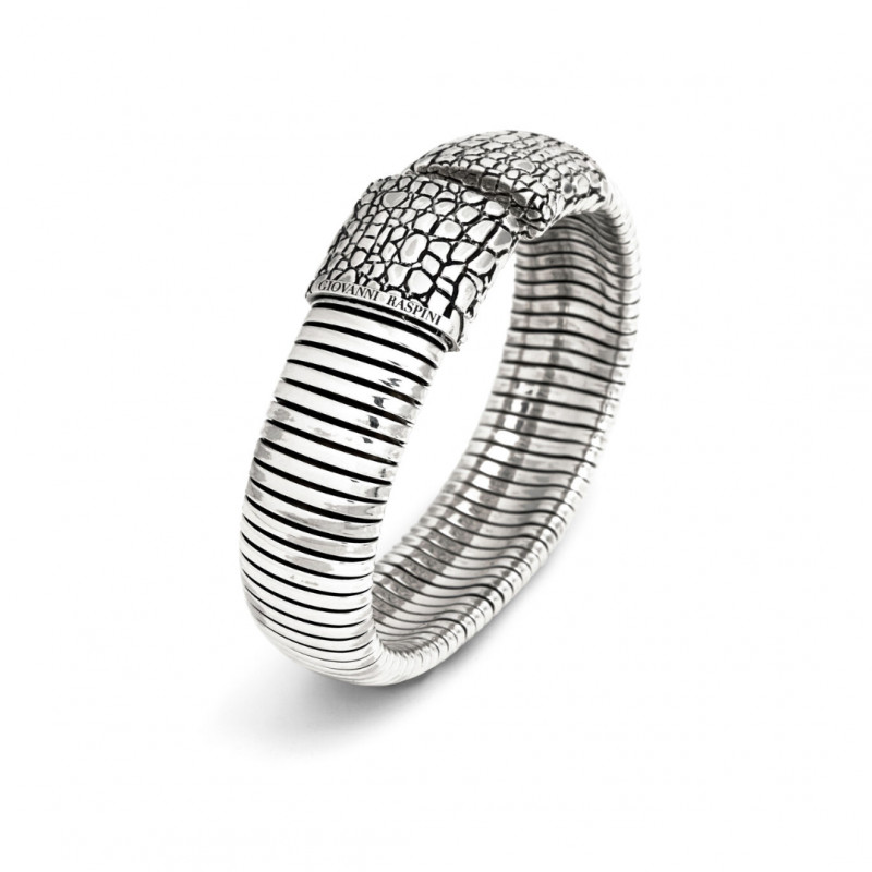 Luminosissimo ed elegante, realizzato in maglia tubogas, questo grande bracciale in argento è un vero evergreen della gioielleria dal Novecento ad oggi. In questa versione, Giovanni Raspini lo reinterpreta aggiungendo la texture di coccodrillo alle estremità, realizzate in argento fuso a cera persa. Un gioiello iconico, dal carattere deciso.