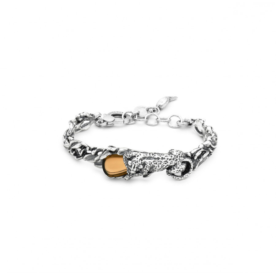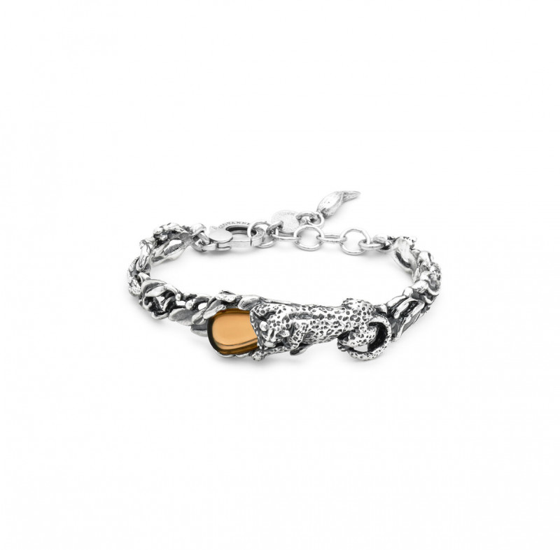 Piccolo capolavoro animalier, il bracciale Goccia Leopardo unisce la raffinatezza di un leopardo disteso, realizzato in argento con la tecnica della fusione a cera persa, all'intensità del cristallo color giallo citrino. Il design semirigido è completato da una catena in argento, per un gioiello fatto a mano che esprime equilibrio, forza e bellezza.