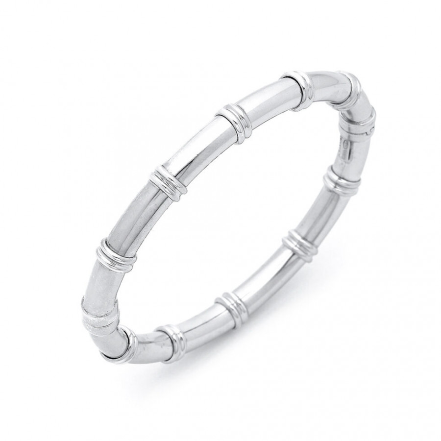 La lavorazione a canna vuota arricchita da coppie di anelli torniti e saldati sul gioiello, regala a questo bangle un aspetto lineare e di grande luminosità. Un bracciale contemporaneo in argento da abbinare anche ad altre creazioni Giovanni Raspini. Realizzato artigianalmente in azienda.