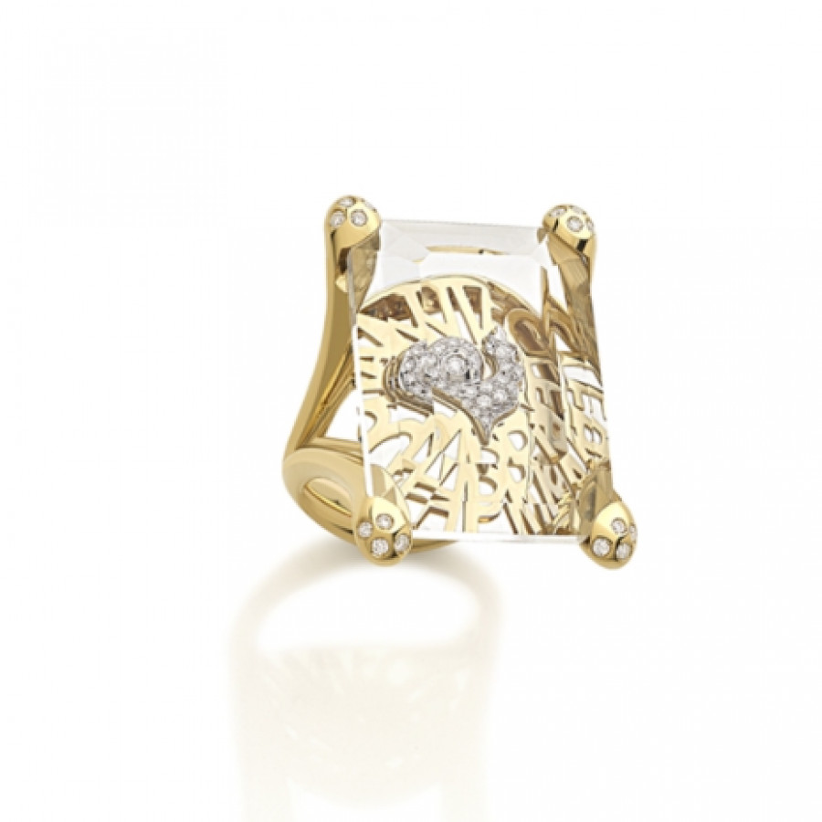 Anello in oro giallo 18Kt, con gallo incassato in diamanti e siamite, di Chantecler appartenente alla collezione Logo.