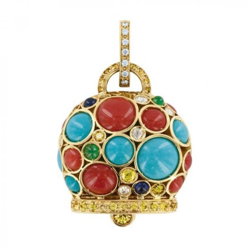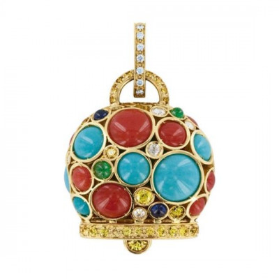 Ciondolo Campanella maxi in oro giallo con corallo rosso, turchese, smeraldi, zaffiri e diamanti, appartenente alla collezione Capri 1947 di Chantecler