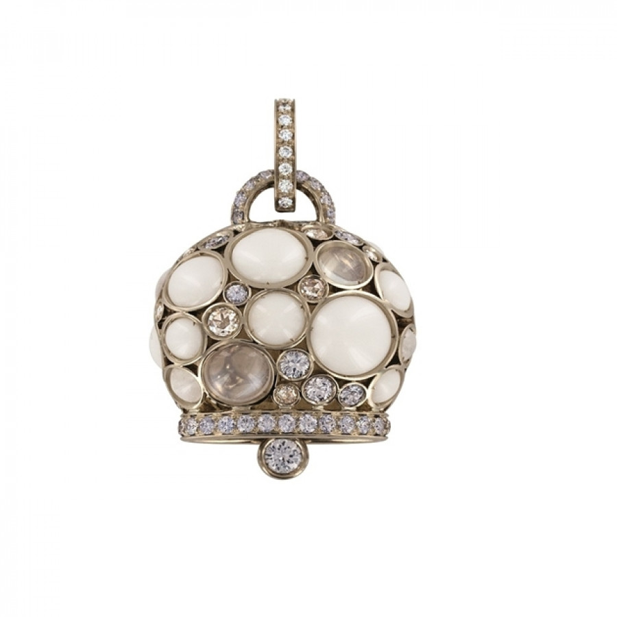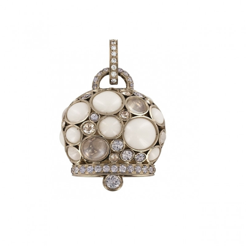 Ciondolo Campanella maxi in oro giallo con corallo bianco, pietra di luna, labradorite, zaffiri grigi e diamanti, appartenente alla collezione Capri 1947 di Chantecler