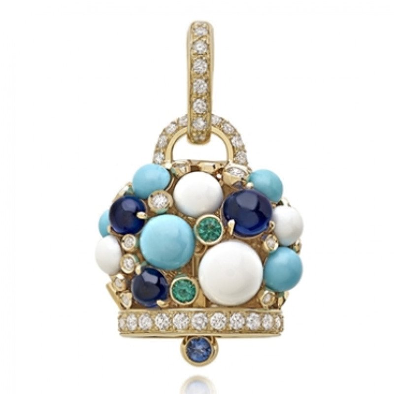 Ciondolo Campanella piccolo i in oro bianco non rodiato, smeraldi, turchesi, kogolong, zaffiri blu e diamanti, appartenente alla collezione Capri 1947 di Chantecler
