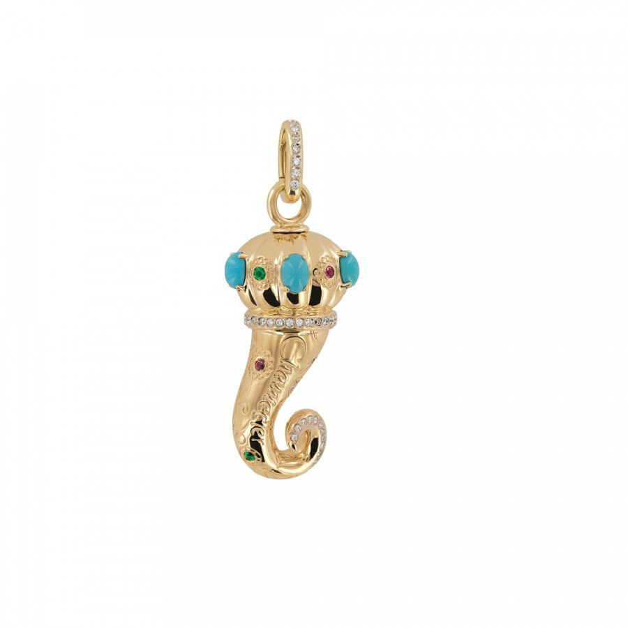 Ciondolo maxi Corno in oro giallo con turchese, zaffiri, rubini, smeraldi e diamanti, appartenente alla collezione Suamèm di Chantecler